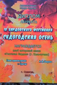Диплом лауреата Судогодская осень клуб Гостиная бардов 2013